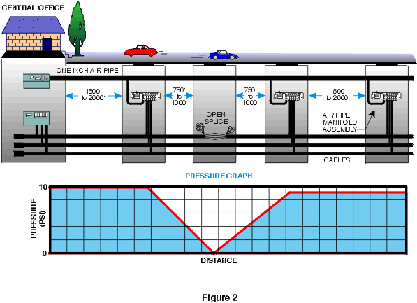 The Power Pipe System is the perfect solution. Typically, in this design air pipe manifolds are spaced 1500 to 2000 feet apart, so the system not only provides built-in buffering, but better overall cable protection as well. The closer manifolds help to keep cable pressures higher throughout the route, and they provide effective buffering points (Figure 2). The larger diameter pipe easily handles any additional flow requirements caused by the closer manifold spacing and splicing activity.